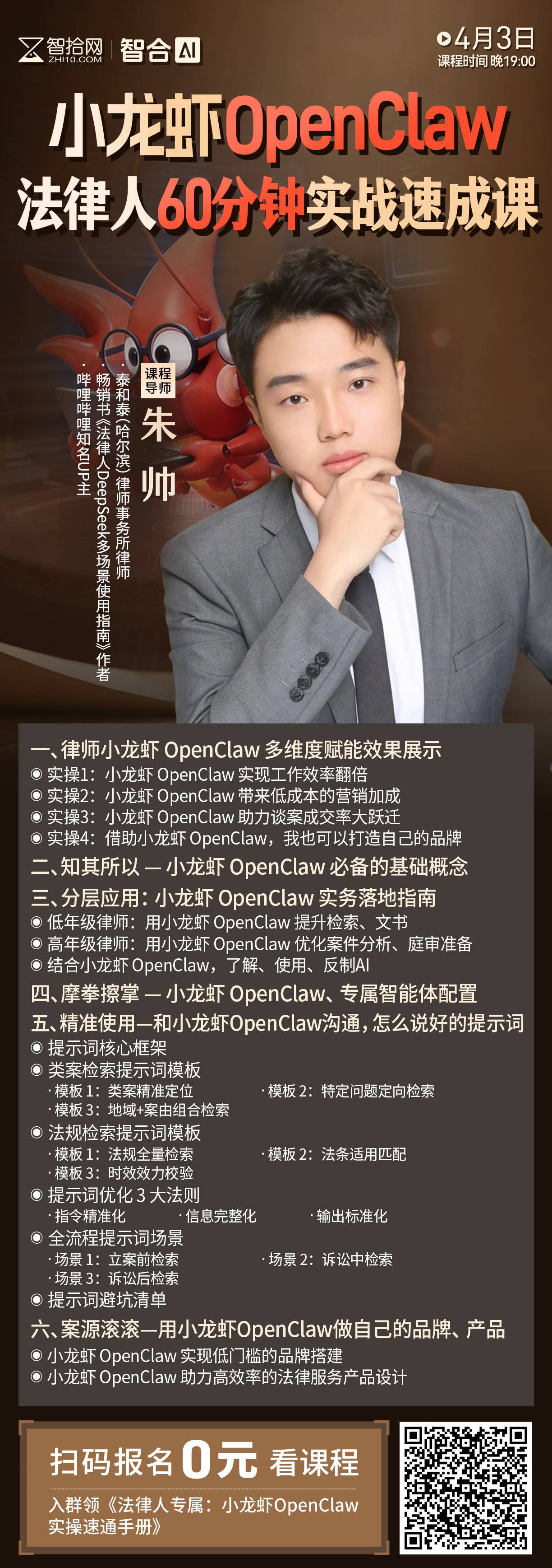【免费直播】朱帅:小龙虾OpenClaw法律人60分钟实战速成课