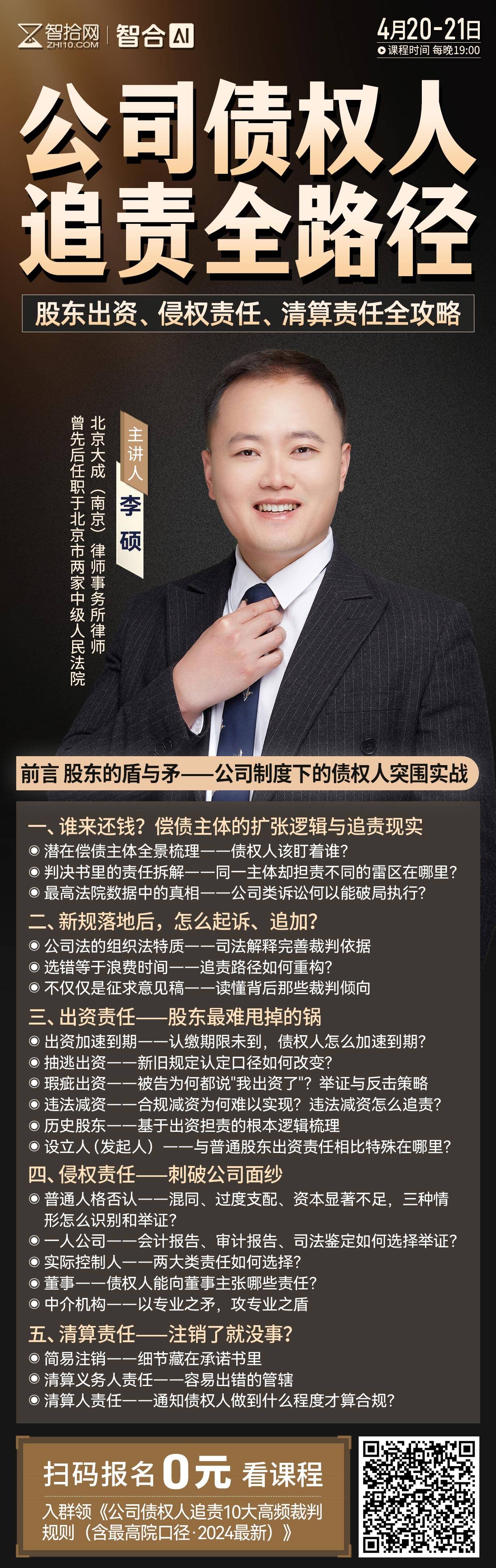 【两天免费直播】李硕:公司债权人追责全路径——股东出资、侵权责任、清算责任全攻略
